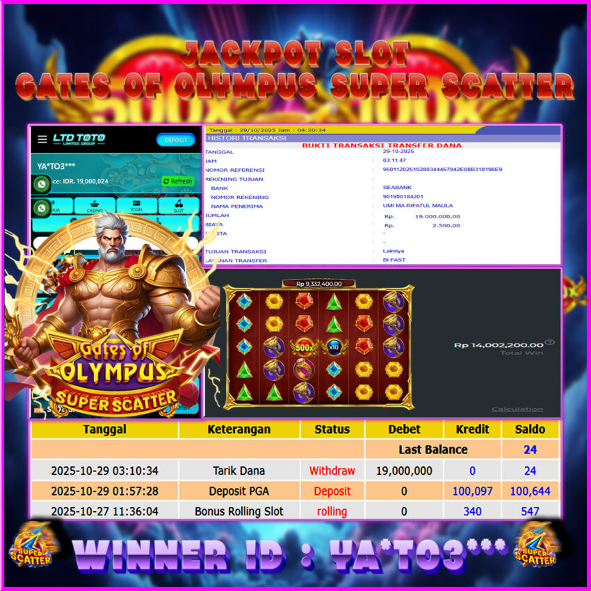 LTDTOTO JACKPOT GATES OF OLYMPUS SUPER SCATTER RP 19.000.000 RABU 29 OKTOBER 2025